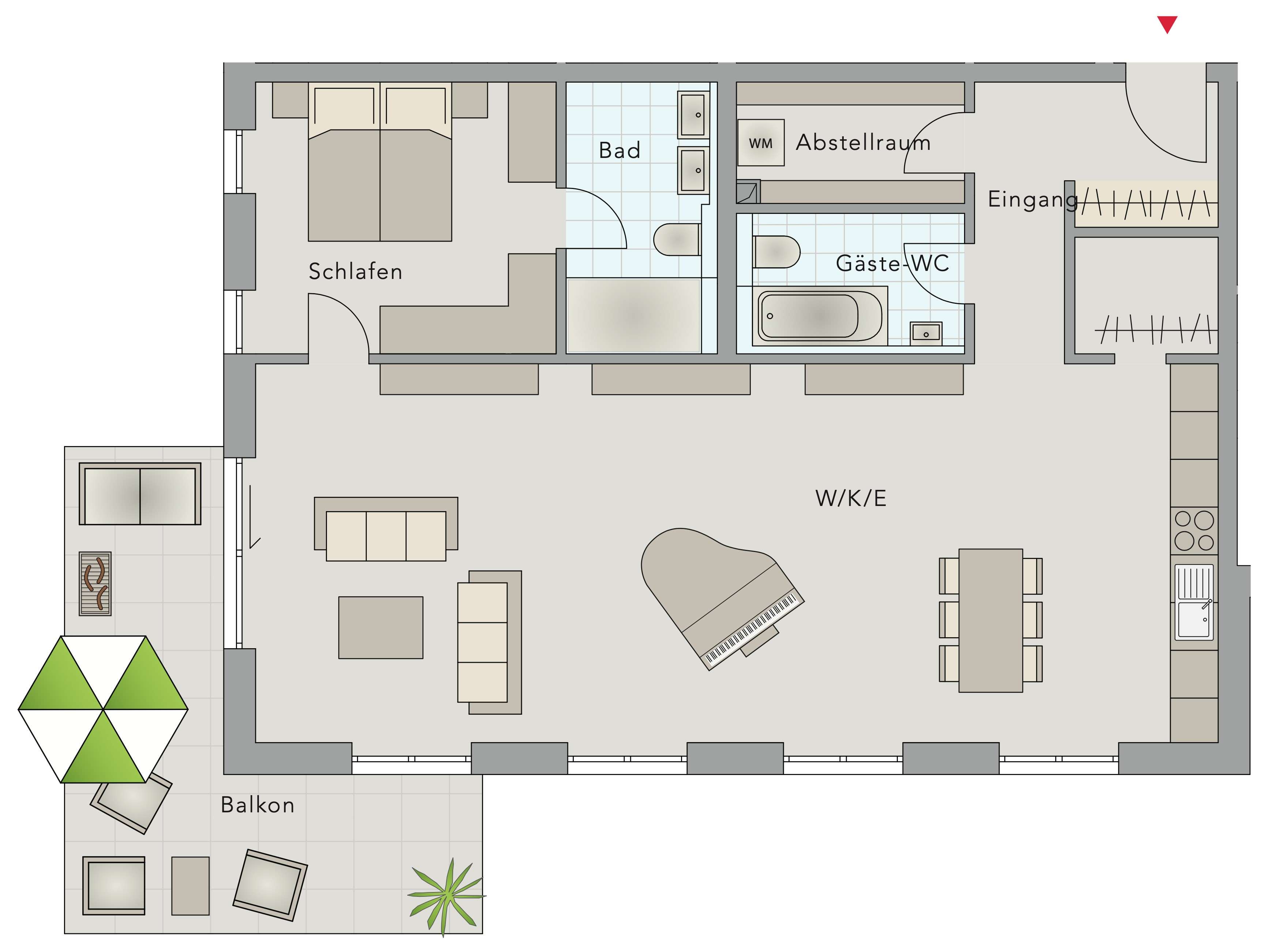 Die Möblierung dient der Präsentation der Wohnung und wurde vom Bauträger installiert.