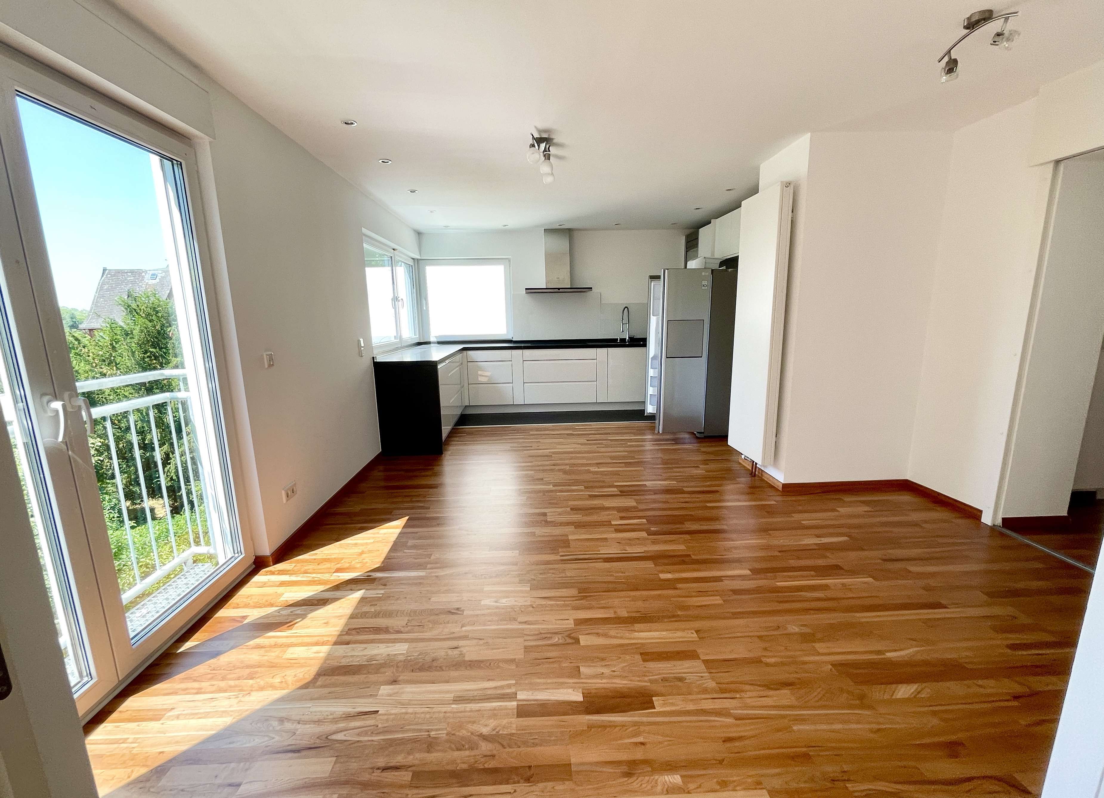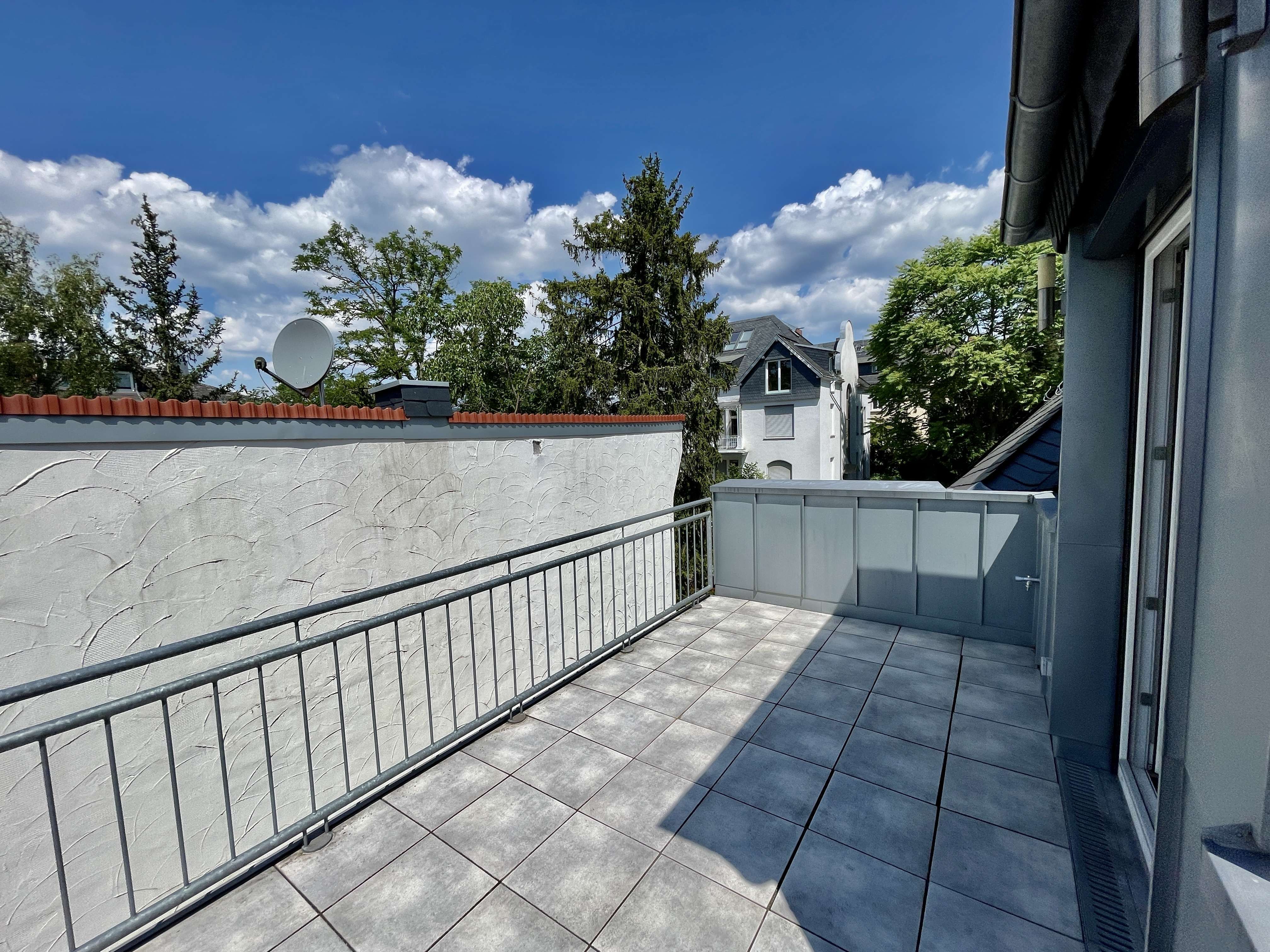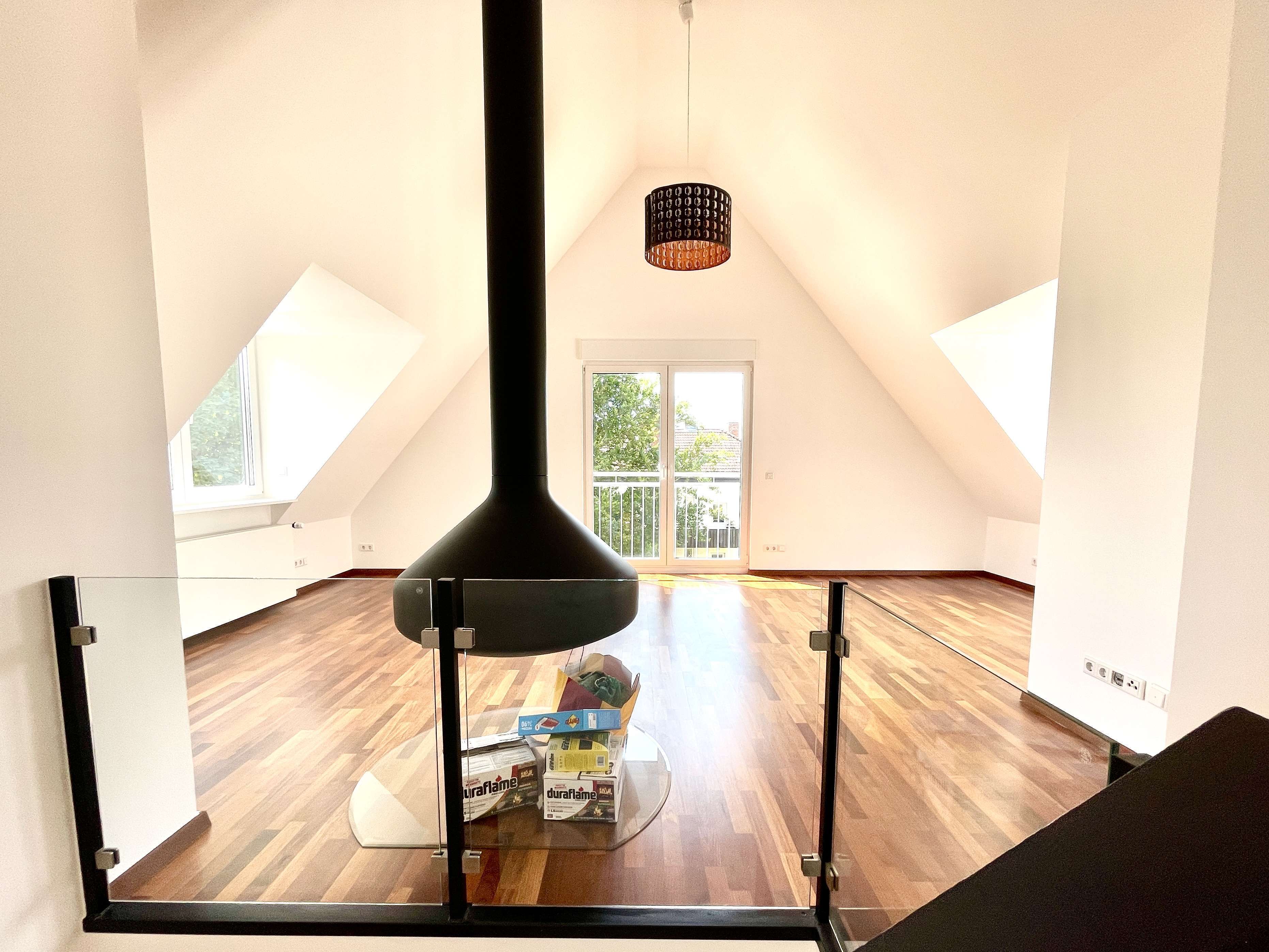 Über eine Treppe im Flurbereich gelangen Sie in den offenen und modernen Wohnbereich inkl. einem Kamin. Von dort aus gelangen Sie auch zur Dachterrasse, die Ihnen einen unglaublichen Blick über Wiesbaden bietet.
