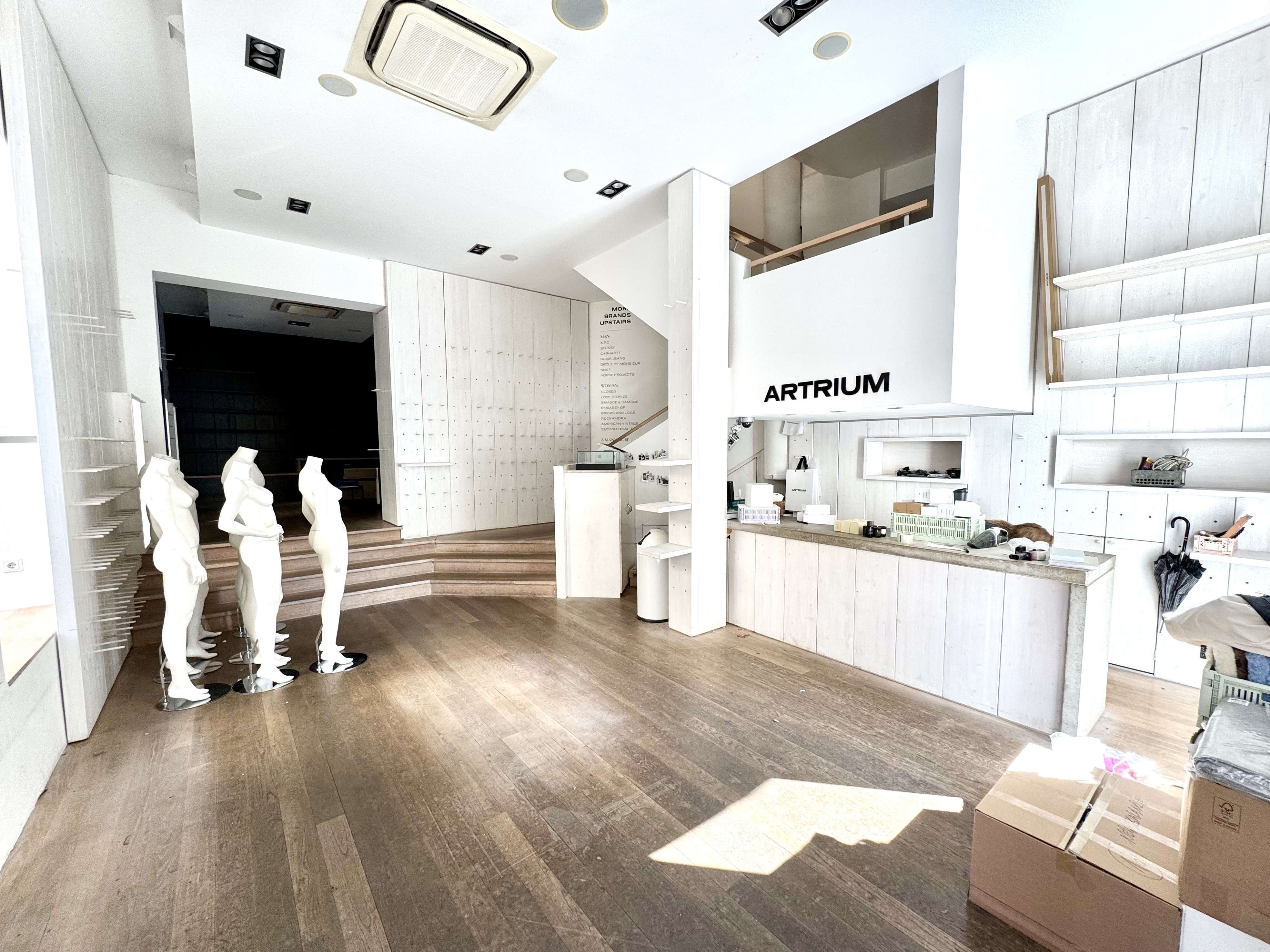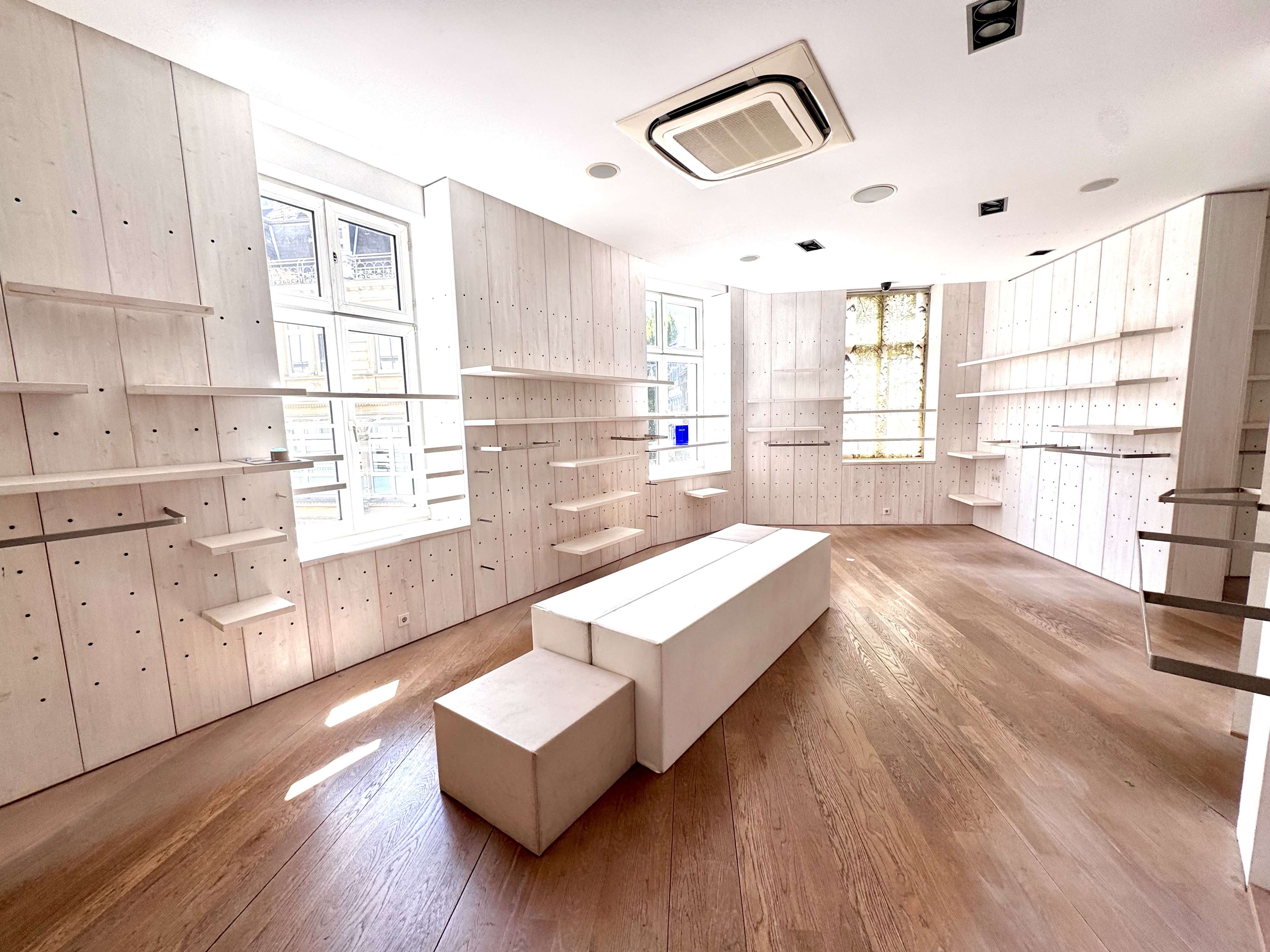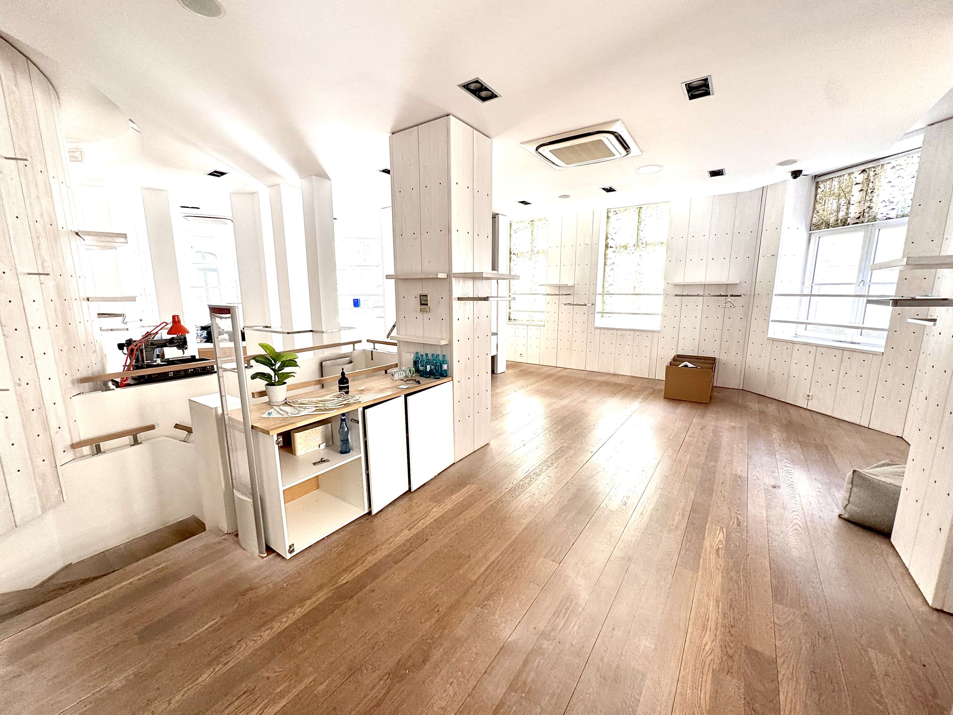 Die Verkaufsfläche (ca. 290m²) ist hell und gradlinig geschnitten. Die Fläche ist auf zwei Ebenen Aufgeteilt EG ca. 97m² und das 1. OG ca.187m² Die Fensterfront sind einladend haben eine gesamtbreite von ca. 14m. Die Fensterfront erstreckt sich über die gesamte Ladenbreite.