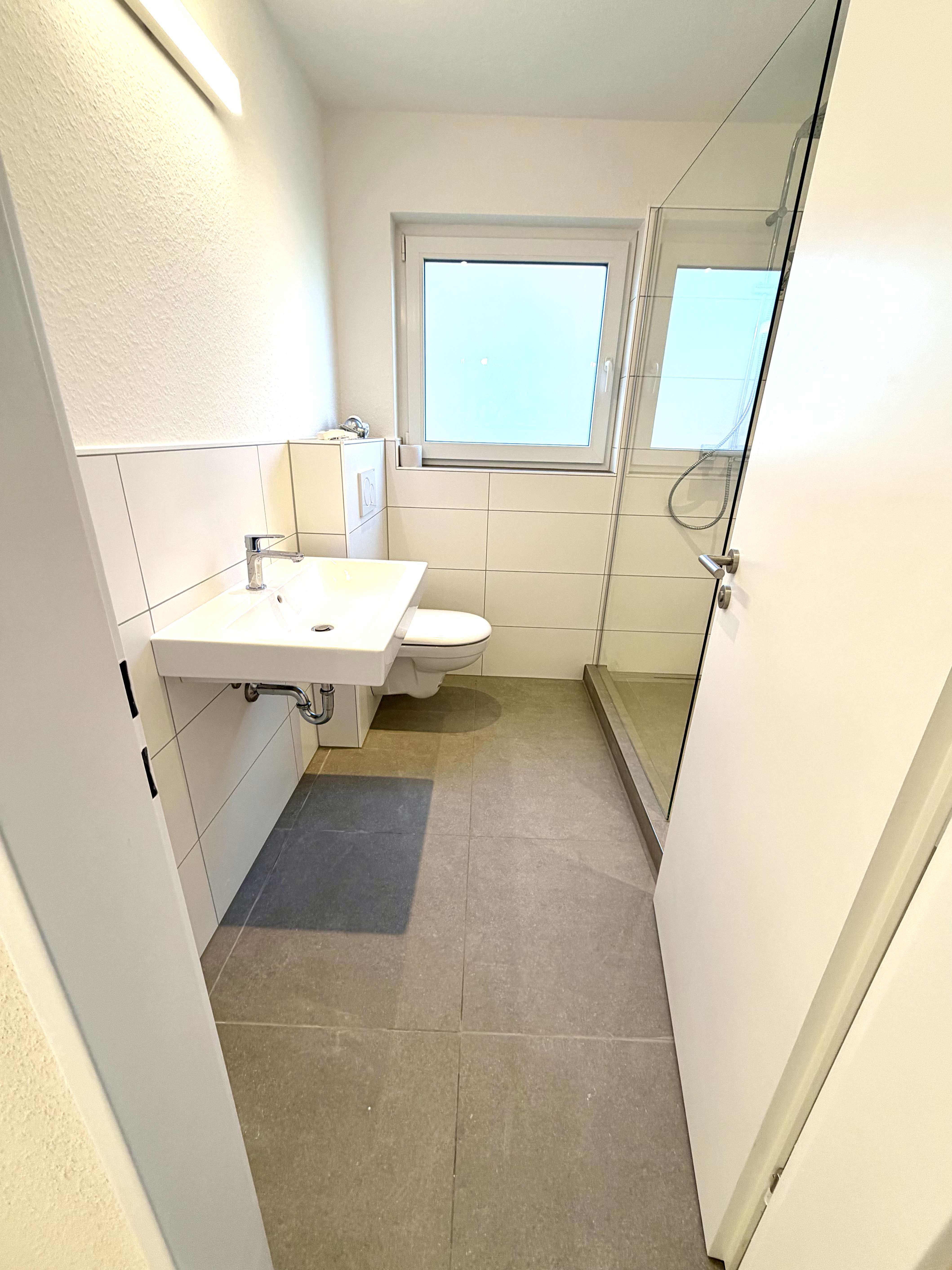 - Komplett saniertes Badezimmer mit Dusche & modernen Fliesen, Handtuchheizkörper, großen Spiegel mit Beleuchtung, Waschbecken mit stilvollen Armaturen.